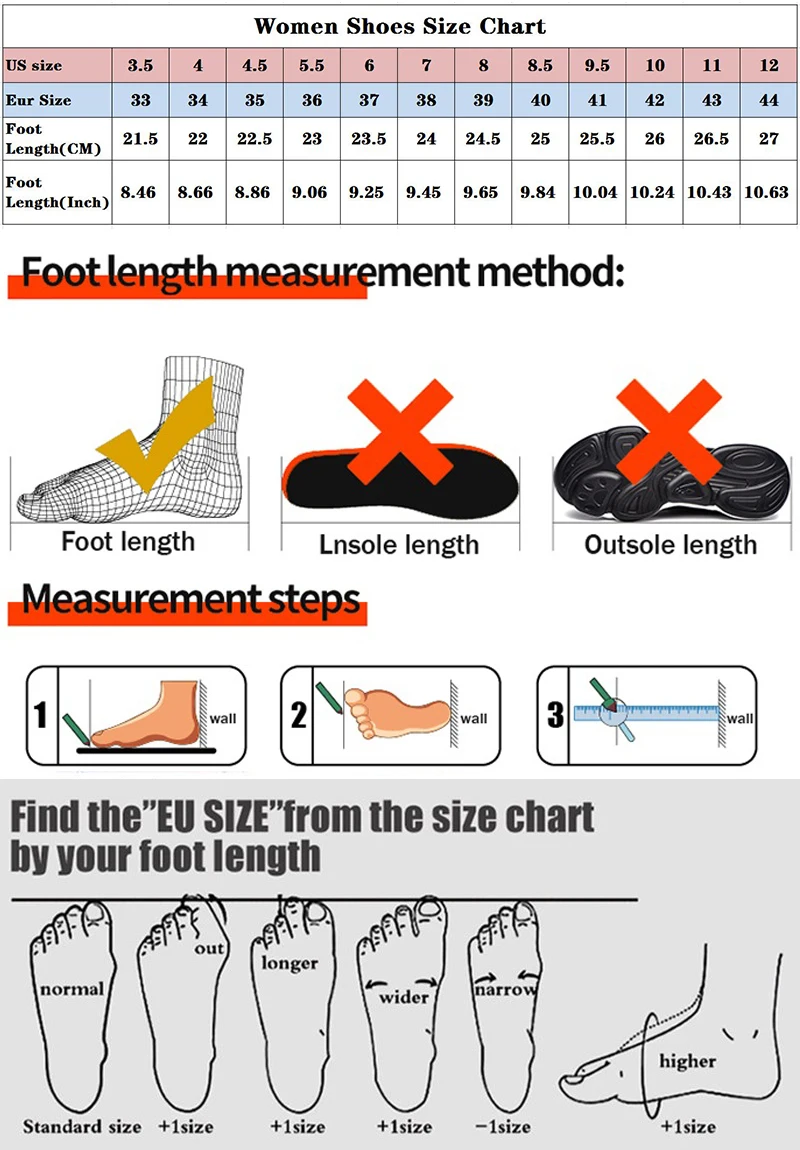 NOTE:pls choose the size according to your foot length,not insole length or sole length.