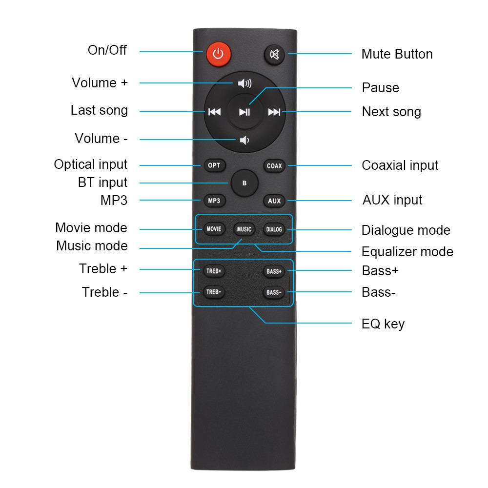 3 different equalizer modes: fine tune your sound bar with 3 distinct equalizer modes (dialogue mode, music mode, movie mode) via the remote control to match your favorite sound.