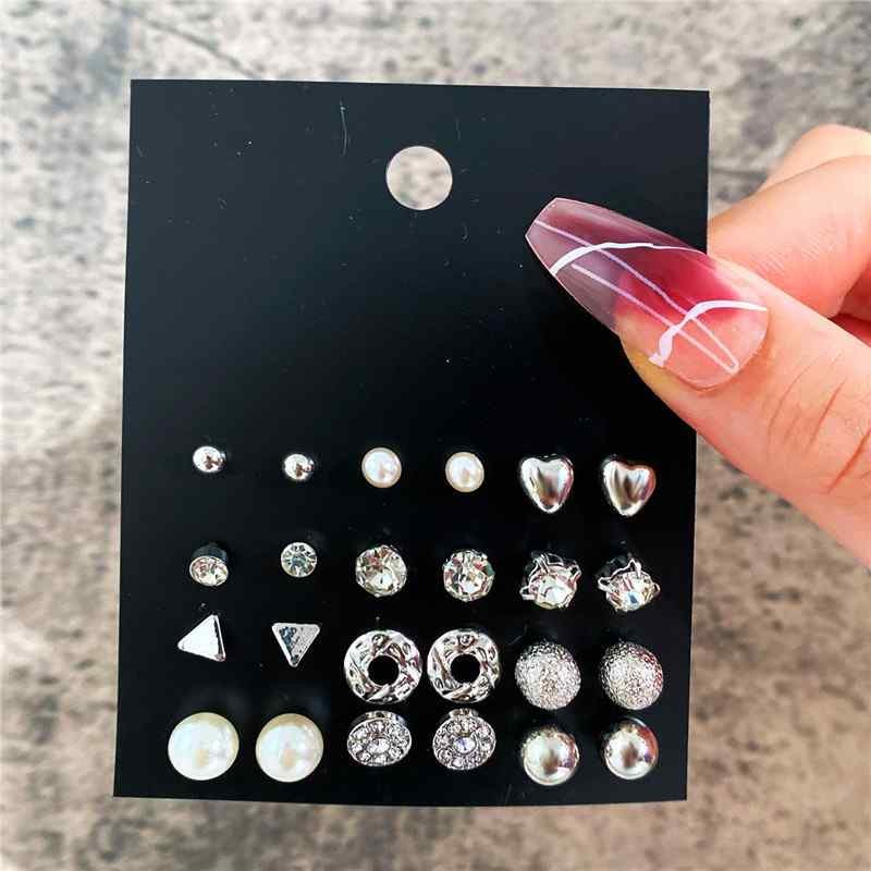 Trendy 12 Pairs/Set Triangle Crystal Heart Stud Earrings for Women Ball Simulated Pearl Flower Wedding Jewelry